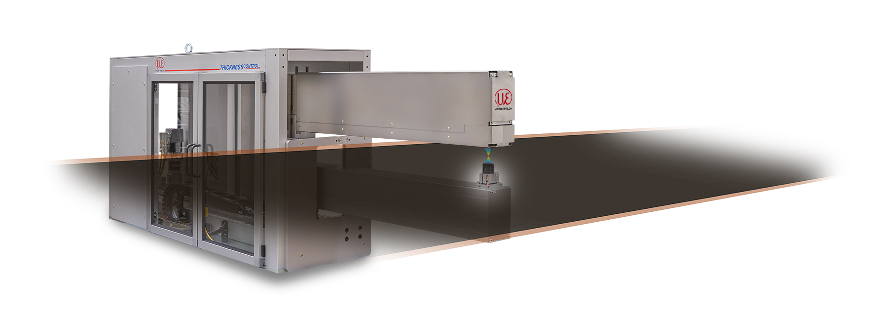 Das »thicknessCONTROL-Quad«-Messsystem besteht aus zwei robusten Messrahmen, die jeweils acht konfokale Sensoren beinhalten. Das System wird zur hochpräzisen Inline-Dickenmessung von beschichteten Batteriefolien eingesetzt und überzeugt durch langzeitstabile Messungen.
