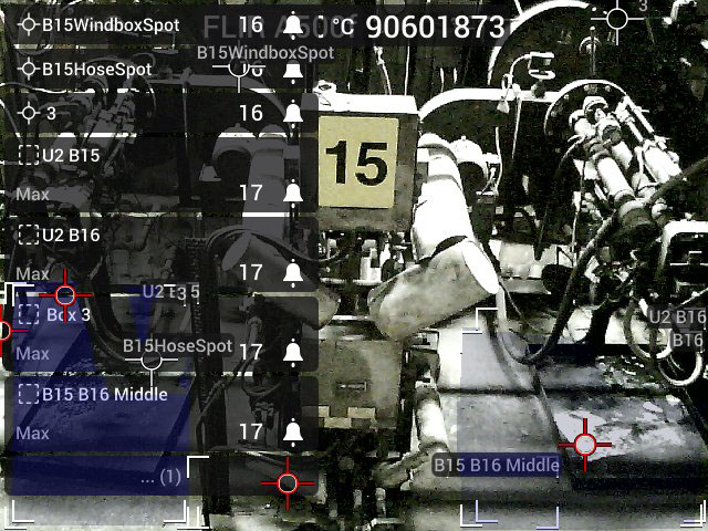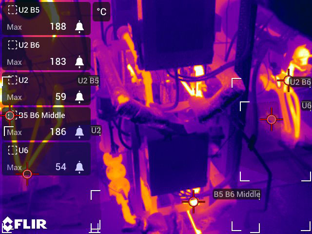 Während das visuelle Bild unauffällig ist, zeigt das Wärmebild unten fünf Alarme, bei denen voreingestellte Temperaturen überschritten wurden.