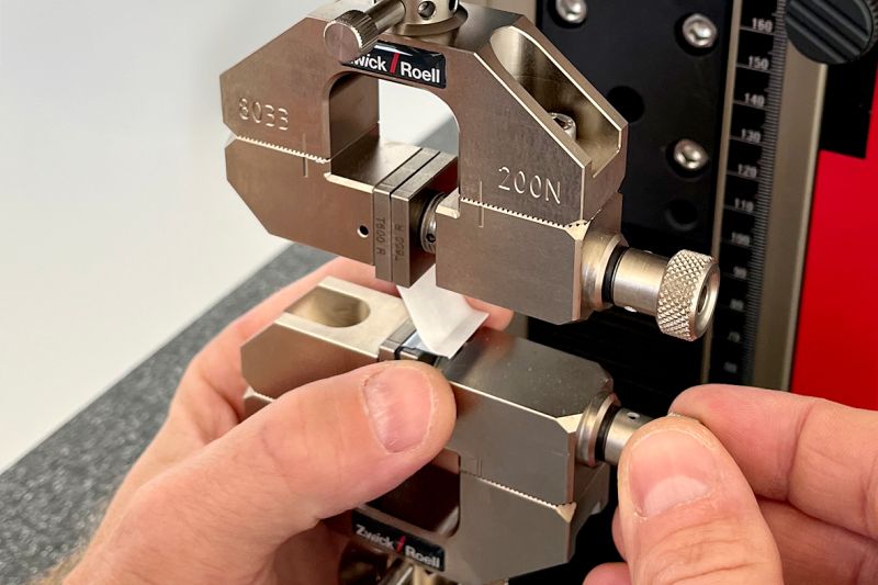Peeltest an Tyvek-Siegelnaht: Die Prüfmaschine misst die Abzugskraft der Siegelnaht – ein entscheidender Kennwert zur Sicherstellung der Sterilität medizinischer Verpackungen. Bild: ZwickRoell GmbH & Co. KG