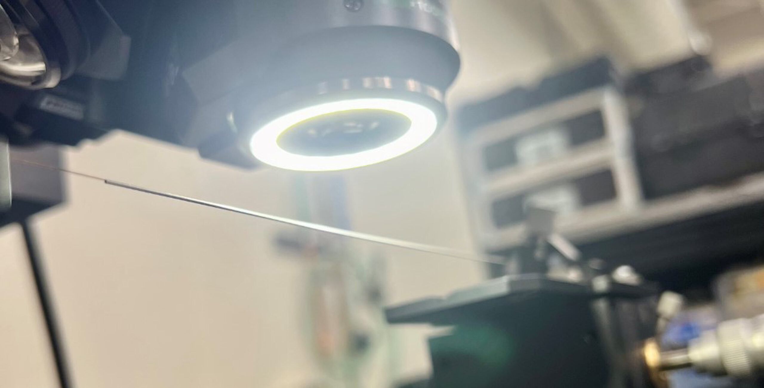 Ein lasergeschnittenes Hypotube (LCHT), wird mit einem Digitalmikroskop vermessen. Dieses Bild wurde bei 200-facher Vergrößerung aufgenommen.