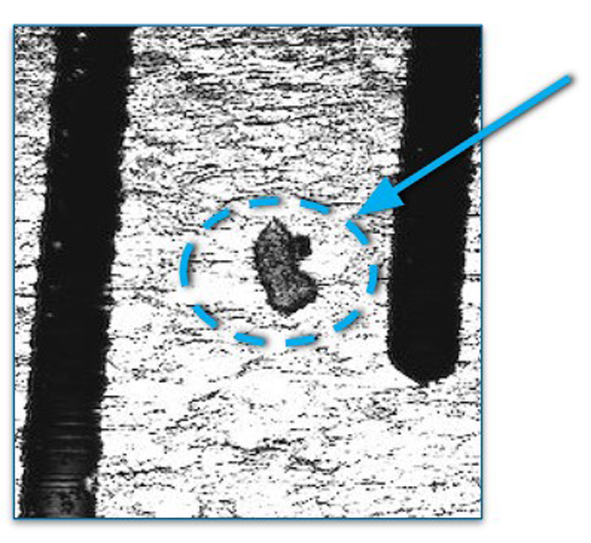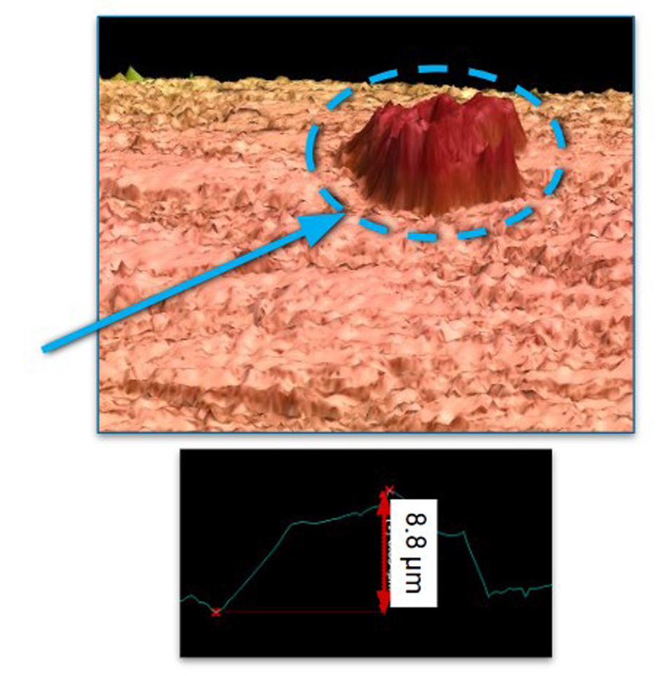 Mithilfe der 3D-Daten lässt sich die Oberfläche im Winkel betrachten – so wird deutlich, dass es sich bei dem sichtbaren Defekt um einen Überstand handelt. Dieser kann vermessen und mit den Spezifikationen abgeglichen werden. In diesem Fall beträgt die ermittelte Fehlerhöhe 8,8 Mikrometer.