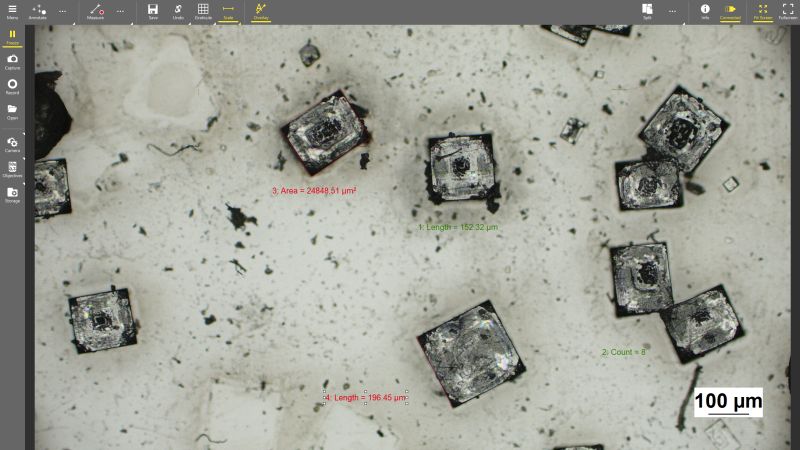 Nikon NIS-Elements LE Software - selbst gezüchtete Salzkristalle, Anwendung zeigt Kristallinspektion mit Partikelanalyse.